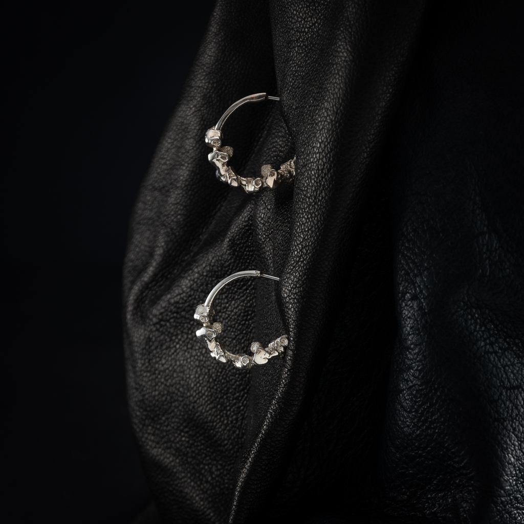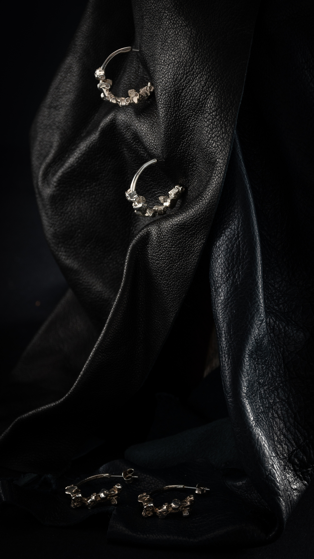 Estos aros se inspiran en la solidez y la belleza natural de las piedras. Con formas irregulares y texturas que evocan minerales auténticos, su diseño capta la esencia rústica y elegante de la naturaleza. Cada pieza es única, combinando la modernidad del diseño con el encanto ancestral de las gemas, lo que los convierte en el complemento perfecto para un estilo con carácter y autenticidad.
